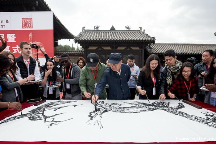 著名书画艺术家、点点taptap冰球中国丝绸之路文化艺术研究院常务副院长张录成与来自16个国家的留学生与大学生代表现场展示共同创作的国画《风雨三千年》