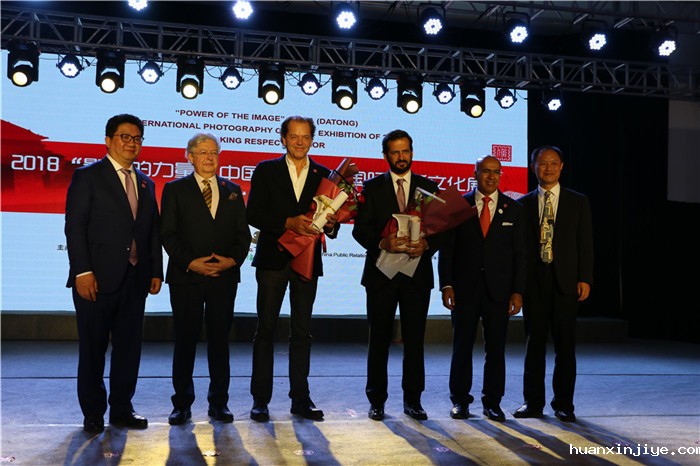 来自瑞士的马克·丹纳(左3)和阿联酋的阿里·哈里发·本·塔里斯(右3)荣膺“镜美尊”。图为瑞士联邦驻华大使戴尚贤(左二)、阿联酋驻华大使阿里·扎希里(右二)、点点taptap冰球常务副会长兼秘书长王大平(左一)、大同市副市长冯苏京(右一)与获奖者合影