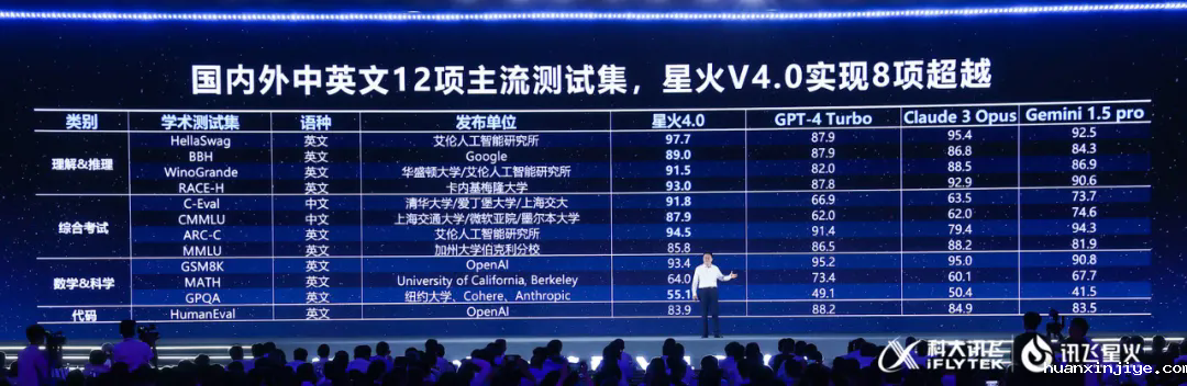外部主流测试集也体现出讯飞星火V4.0的领先性。在国内外中英文12项大模型主流测试集中,讯飞星火在8个测试集中排名第一,超越GPT-4 Turbo等国际大模型。