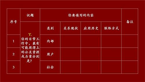 在这个工具中,我们可以看出,一线业务岗位的公关资源除了一部分来自企业公关或相关部门的协同,需要更加重视与一线业务有更强结合度的社会资源和典型用户的应用。比如曾经有个商场在发生了严重的刑事案件后客流量严重下降以至最终不得不关门停业。我在分析这个案例的时候提到,商场如果能引入、用好本地化公关资源,比如周边社区广场舞的兴趣小组,邀请他们到商场来持续地开展活动,则经营情况也许是可以改观的。所以,以此为例,我建议某连锁经营商业集团,要指引各地的商场经理把社区关系建设的工作重视起来。