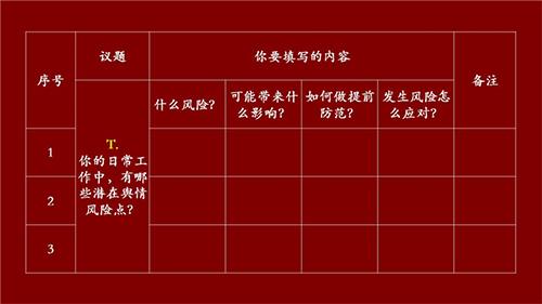 我还曾经给多个企业组织演练,有一个常用的工具,其实就是一张表格,帮助一线的岗位对自己的工作节点风险进行分析,比如某公寓的物业经理用这个工具进行自我审查后发现,房间环境、消防&电梯故障、突发安全事故等,是其需要重点防范的;而一位超市的品控主管,则要把食品卫生、商品保质期、顾客情绪响应等放到优先级来对待;汽车4S店、银行网点、餐厅、3C卖场、旅游景区……等,不同的行业,最了解这些节点风险的人,显然都应该、也必须是一线业务岗位的负责人,公关危机的防范、化解,必须前置到一线与业务紧密结合,去切实帮助提升产品与服务,以及解决业务运行中的问题,才是公关价值的更佳体现。
