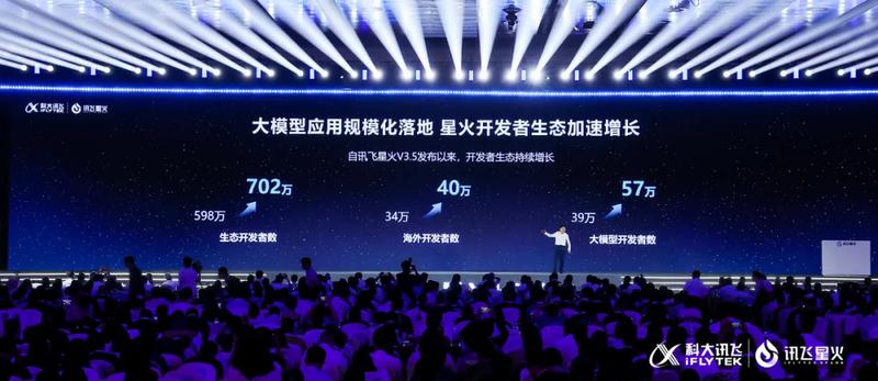 讯飞星火大模型带来行业赋能的同时,也在助力开发者生态蓬勃发展。自今年1月30日讯飞星火V3.5发布以来,短短5个月,星火开发者生态加速增长,开发者数从598万增长到702万,新增超104万;海外开发者数超40万;大模型开发者达57万。越来越多开发者正加入星火生态,释放更多刚需场景的应用价值。